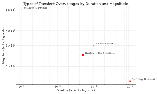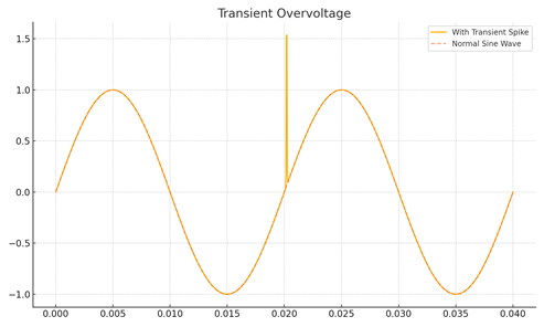A transient overvoltage is a brief, high-amplitude spike in voltage that typically lasts only a few microseconds to milliseconds. These surges can reach several kilovolts and are not part of the normal sinusoidal waveform. They are also known as spikes, surges, or impulses depending on their shape and cause.