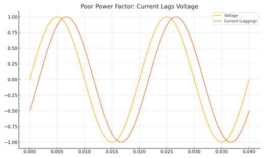 – Lagging PF (< 1) occurs in inductive loads (motors, transformers)