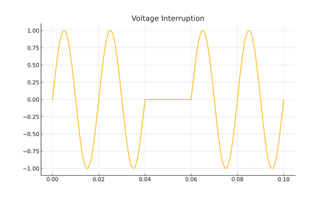 A voltage interruption is a complete loss of electrical voltage supply in one or more phases of a system. It differs from a sag (partial drop) or a swell (temporary rise) because the voltage drops to zero or near-zero levels. Interruptions can last for milliseconds to several minutes, depending on the cause and system protection responses.